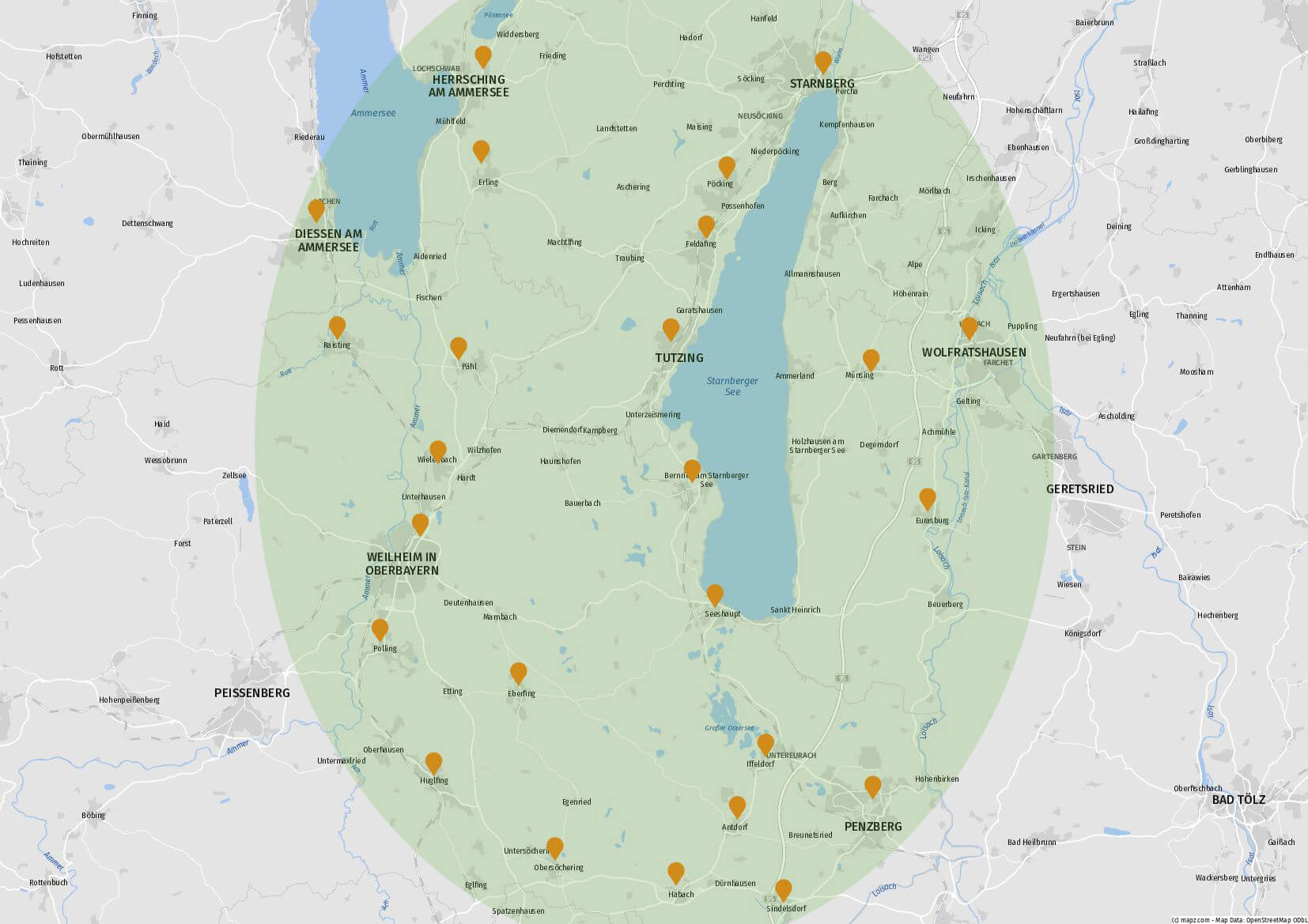 Andechs, Antdorf, Bernried am Starnberger See, Dießen, Eberfing, Eurasburg, Feldafing, Habach, Herrsching am Ammersee, Huglfing, Iffeldorf, Münsing, Obersöchering, Pähl, Penzberg, Polling, Pöcking, Raisting, Seeshaupt, Sindelsdorf, Starnberg, Tutzing, Weilheim in Oberbayern, Wielenbach, Wolfratshausen